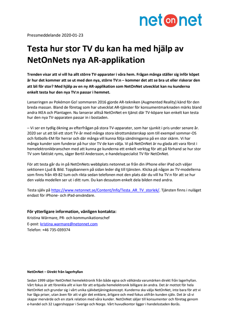 Trenden visar att vi vill ha allt större TV-apparater i våra hem. Frågan många ställer sig inför köpet är hur det kommer att se ut med den nya, större TV:n – kommer det att se bra ut eller riskerar den att bli för stor? Med hjälp av en ny AR-applikation som NetOnNet utvecklat kan nu kunderna enkelt testa hur den nya TV:n passar i hemmet.