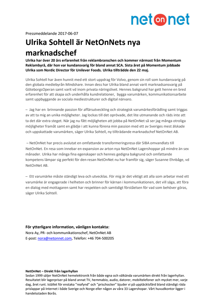Ulrika Sohtell är NetOnNets nya marknadschef