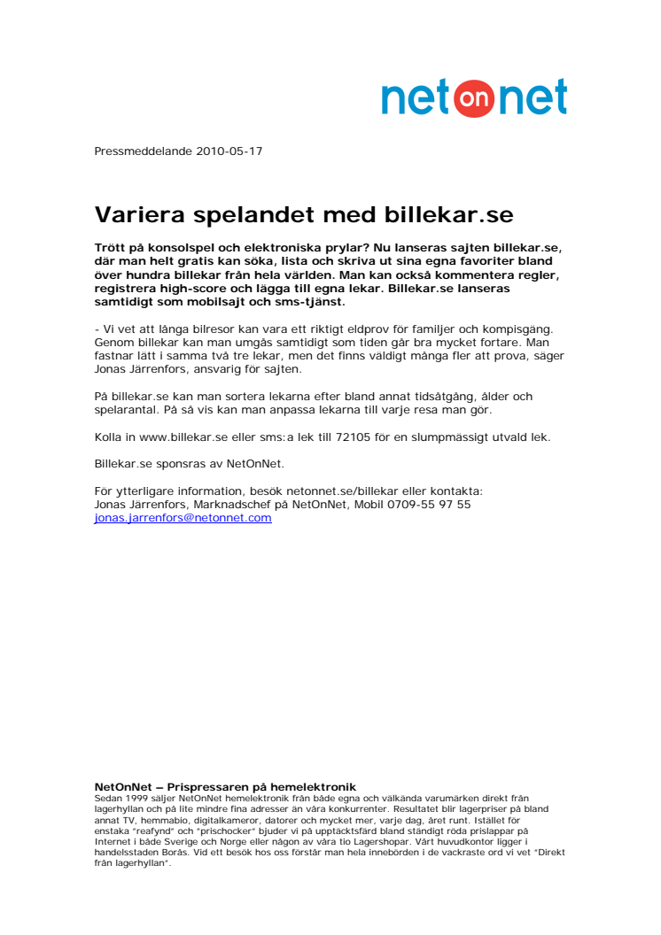 Trött på konsolspel och elektroniska prylar? Nu lanseras sajten billekar.se, där man helt gratis kan söka, lista och skriva ut sina egna favoriter bland över hundra billekar från hela världen. Man kan också kommentera regler, registrera high-score och lägga till egna lekar. Billekar.se lanseras samtidigt som mobilsajt och sms-tjänst.