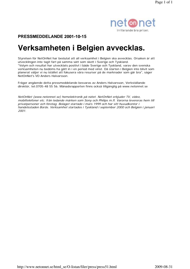 Styrelsen för NetOnNet har beslutat att all verksamhet i Belgien ska avvecklas. Orsaken är att utvecklingen inte tagit fart på samma sätt som skett i Sverige och Tyskland.