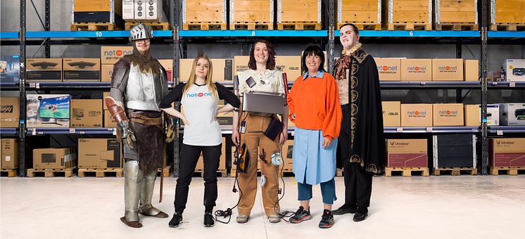 En riddare, en vampyr och en magnetisk kvinna spelar huvudrollerna i NetOnNets nya kampanj. Här syns alla karaktärerna tillsammans med NetOnNets marknadschef Carola Tiberg.