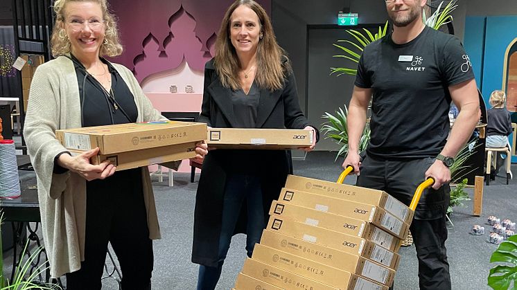 Lisa Belfrage, verksamhetsledare på Navet (till vänster) och Peter Krahl Rydberg, projektledare för Tekniktrappan tar emot 16 nya datorer från Anne-Sofie Johanson, CIO på NetOnNet (i mitten).
