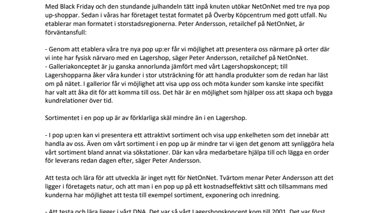 Med Black Friday och den stundande julhandeln tätt inpå knuten utökar NetOnNet med tre nya pop up-shoppar. Sedan i våras har företaget testat formatet på Överby Köpcentrum med gott utfall. Nu etablerar man formatet i storstadsregionerna. Peter Andersson, retailchef på NetOnNet, är förväntansfull: