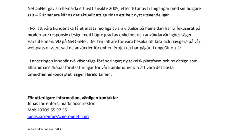 modernare responsiv design med högre grad av enkelhet och användarvänlighet säger Harald Ennen, VD på NetOnNet. Det blir lättare för våra besöka att läsa och navigera på vår webplats oavsett vad de använder för enhet. Projektet har pågått i ungefär ett år.