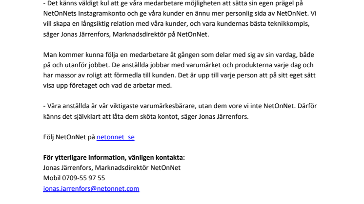 - Det känns väldigt kul att ge våra medarbetare möjligheten att sätta sin egen prägel på NetOnNets Instagramkonto och ge våra kunder en ännu mer personlig sida av NetOnNet. Vi vill skapa en långsiktig relation med våra kunder, och vara kundernas bästa teknikkompis, säger Jonas Järrenfors, Marknadsdirektör på NetOnNet.
