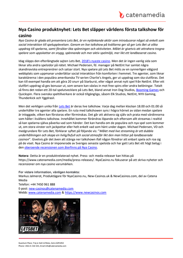 Nya Casino är glada att presentera Lets Bet, är en nytänkande aktör som introducerar något så enkelt som social interaktion till spelupplevelsen. Genom en live talkshow så ger Lets Bet ut olika uppdrag till spelarna, samt försöker öka spänningen och aktiviteten. Målet är att attrahera trogna spelare som uppskattar en snygg, spännande och mer aktiv spelmiljö, mer likt ett landbaserat casino.