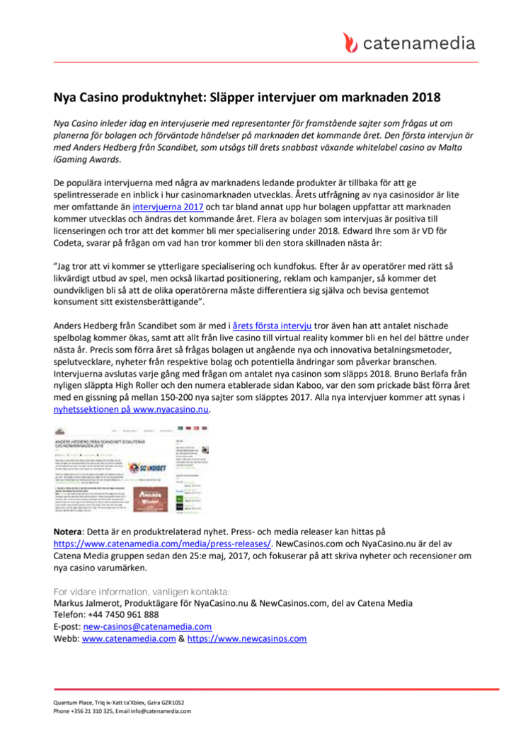 Nya Casino produktnyhet: Släpper intervjuer om marknaden 2018