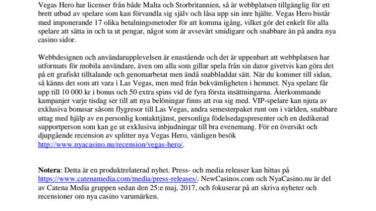 Webbdesignen och användarupplevelsen är enastående och det är uppenbart att webbplatsen har utformats för mobila användare, även om alla som gillar spela från sin dator givetvis kan göra det på ett grafiskt tilltalande och genomarbetat men ändå snabbladdat sätt. När du kommer till sidan, så känns det som att vara i Las Vegas, men med från bekvämligheten i hemmet. Nya spelare får upp till 10 000 kr i bonus och 50 extra spins vid de fyra första insättningarna. Återkommande kampanjer varje tisdag ser till att nya belöningar finns att roa sig med. VIP-spelare kan njuta av exklusiva bonusar såsom flygresor till Las Vegas, andra semesterpaket runt om i världen, snabbare uttag med hjälp av en personlig kontakttjänst, personliga födelsedagspresenter och en dedikerad supportperson som kan ge ut exklusiva inbjudningar till bra evenemang. För en översikt och djupgående recension av splitter nya Vegas Hero, vänligen besök http://www.nyacasino.nu/recension/vegas-hero/.