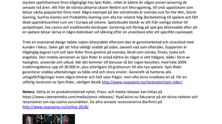 Nya Casino produktnyhet: Spin Rider utses till bästa sajten 2018