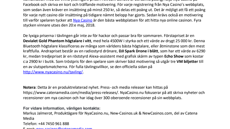 De lyxiga priserna i tävlingen går inte av för hackor och passar bra för sommaren. Förstapriset är en Devialet Gold Phantom högtalare i vitt, med hela 4500W i styrka och ett värde av drygt 25 000 kr. Denna Bluetooth högtalare klassificeras av många som världens bästa högtalare, eller åtminstone som den mest kraftfulla. Andrapriset består av en radiostyrd drönare, DJI Spark Drone i blått, som har ett värde av 6290 kr, medan tredjepriset är en röststyrd Alexa-assistent med grafisk skärm av typen Echo Show som kostar c:a 2900 kr i butik. Som tröstpris för den spelare som skriver bäst motivering så utgår tre VM biljetter till en av slutspelsmatcherna. För fulla tävlingsvillkor, se den officiella sidan på http://www.nyacasino.nu/tavling/.