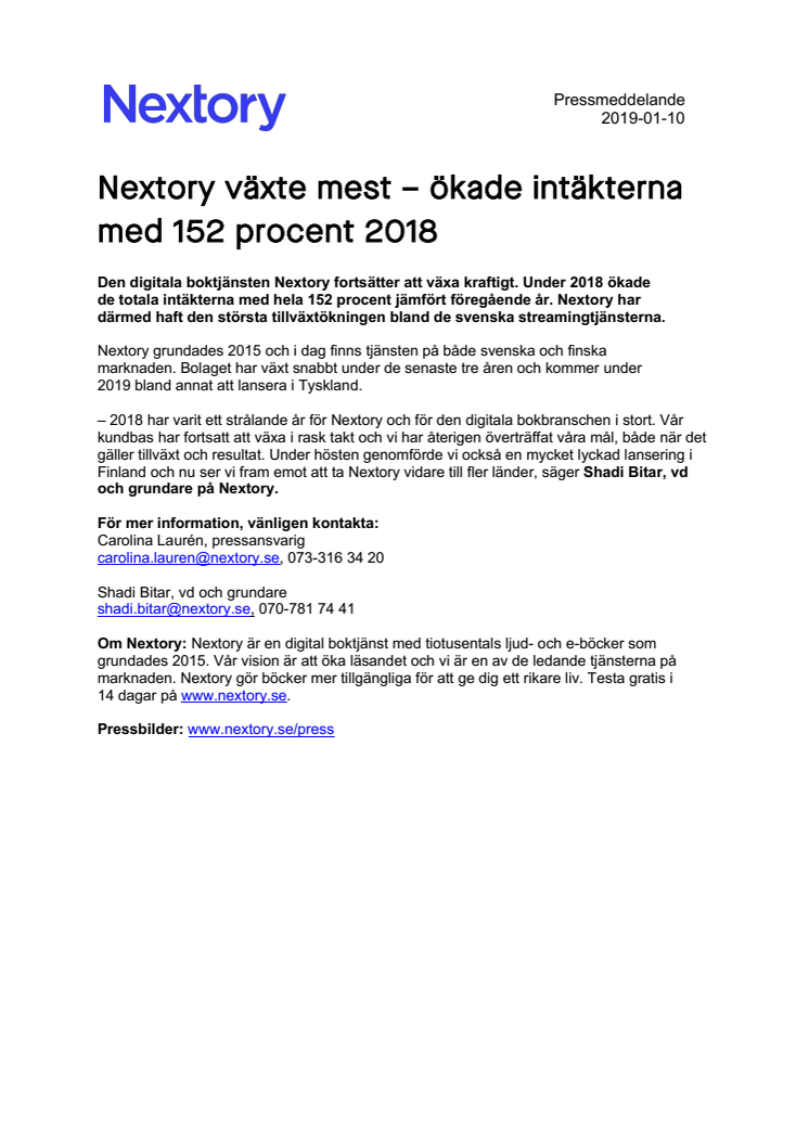 Den digitala boktjänsten Nextory fortsätter att växa kraftigt. Under 2018 ökade de totala intäkterna med hela 152 procent jämfört med föregående år. Nextory har därmed haft den största tillväxtökningen bland de svenska streamingtjänsterna.