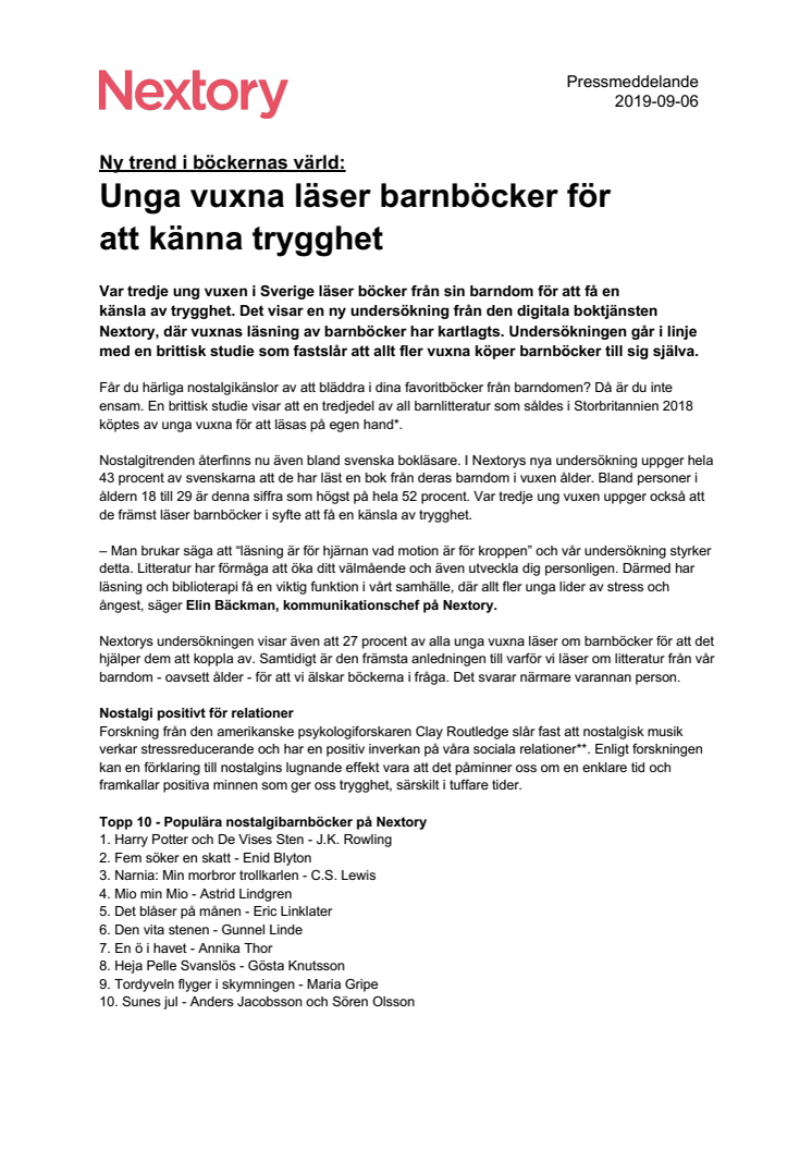 Var tredje ung vuxen i Sverige läser böcker från sin barndom för att få en känsla av trygghet. Det visar en ny undersökning från den digitala boktjänsten Nextory, där vuxnas läsning av barnböcker har kartlagts. Undersökningen går i linje med en brittisk studie som fastslår att allt fler vuxna köper barnböcker till sig själva.