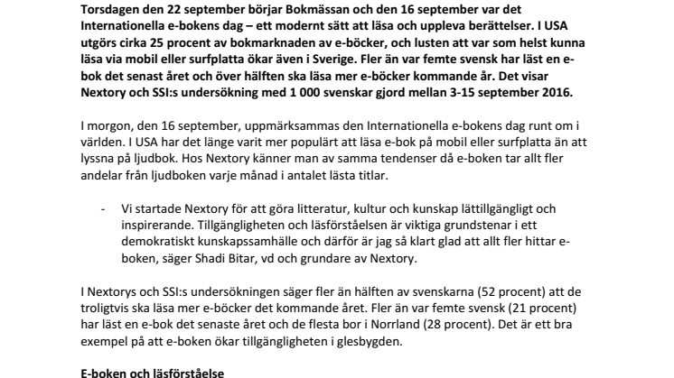 Torsdagen den 22 september börjar Bokmässan och den 16 september var det Internationella e-bokens dag – ett modernt sätt att läsa och uppleva berättelser. I USA utgörs cirka 25 procent av bokmarknaden av e-böcker, och lusten att var som helst kunna läsa via mobil eller surfplatta ökar även i Sverige. Fler än var femte svensk har läst en e-bok det senast året och över hälften ska läsa mer e-böcker kommande år. Det visar Nextory och SSI:s undersökning med 1 000 svenskar gjord mellan 3-15 september 2016.