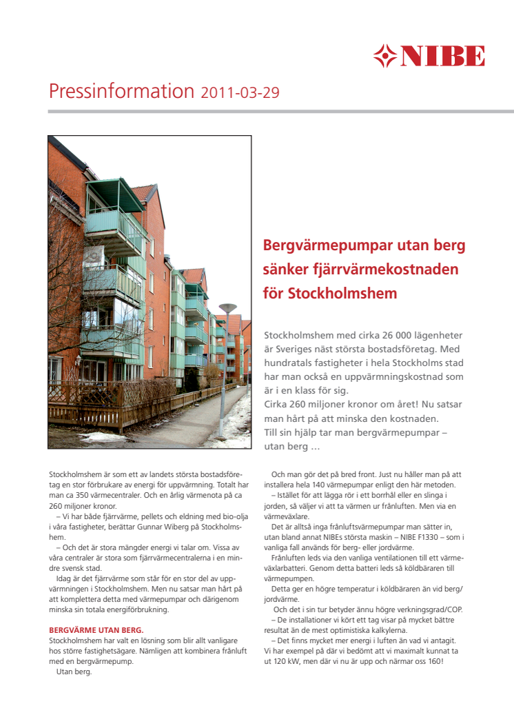 Stockholmshem med cirka 26 000 lägenheter är Sveriges näst största bostadsföretag. Med hundratals fastigheter i hela Stockholms stad har man också en uppvärmningskostnad som är i en klass för sig. Cirka 260 miljoner kronor om året! Nu satsar man hårt på att minska den kostnaden. Till sin hjälp tar man bergvärmepumpar – utan berg …