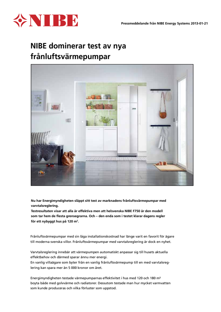 Nu har Energimyndigheten släppt sitt test av marknadens frånluftsvärmepumpar med varvtalsreglering. Testresultaten visar att alla är effektiva men att helsvenska NIBE F750 är den modell som tar hem de flesta grensegrarna. Och – den enda som i testet klarar dagens regler för ett nybyggt hus på 120 m².