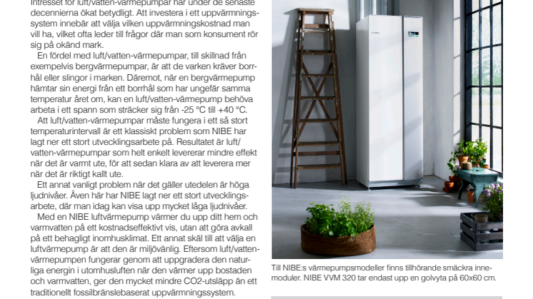 Med en NIBE luftvärmepump värmer du upp ditt hem och varmvatten på ett kostnadseffektivt vis, utan att göra avkall på ett behagligt inomhusklimat. Ett annat skäl till att välja en luftvärmepump är att den är miljövänlig. Eftersom luft/vatten-värmepumpen fungerar genom att uppgradera den naturliga energin i utomhusluften när den värmer upp bostaden och varmvatten, ger den mycket mindre CO2-utsläpp än ett traditionellt fossilbränslebaserat uppvärmningssystem.