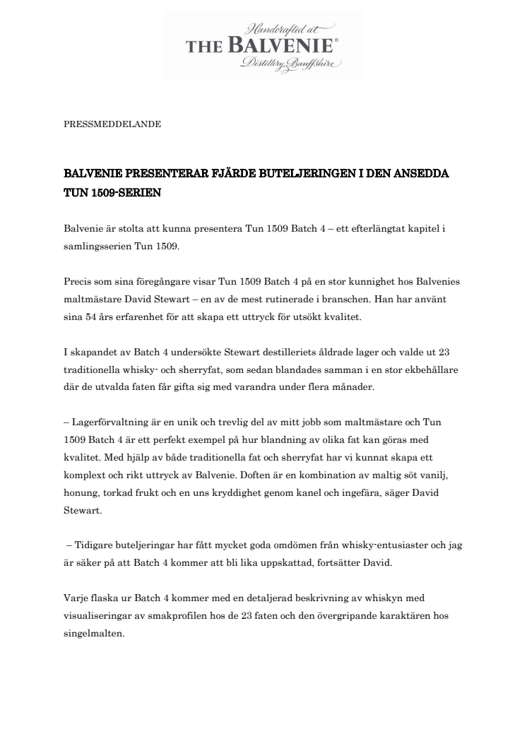 BALVENIE PRESENTERAR FJÄRDE BUTELJERINGEN I DEN ANSEDDA TUN 1509-SERIEN