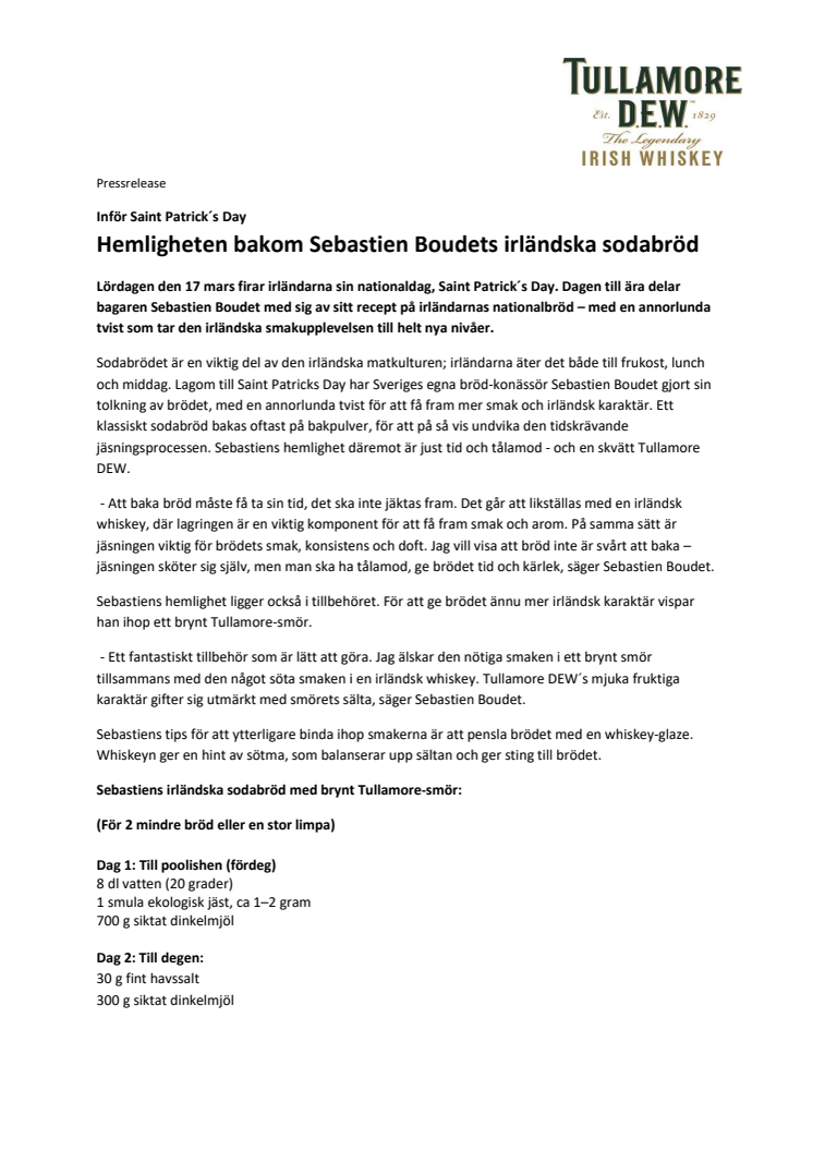 Lördagen den 17 mars firar irländarna sin nationaldag, Saint Patrick´s Day. Dagen till ära delar bagaren Sebastien Boudet med sig av sitt recept på irländarnas nationalbröd – med en annorlunda tvist som tar den irländska smakupplevelsen till helt nya nivåer.