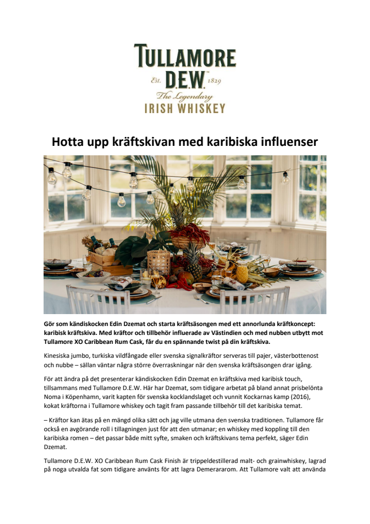Gör som kändiskocken Edin Dzemat och starta kräftsäsongen med ett annorlunda kräftkoncept: karibisk kräftskiva. Med kräftor och tillbehör influerade av Västindien och med nubben utbytt mot Tullamore XO Caribbean Rum Cask, får du en spännande twist på din kräftskiva.