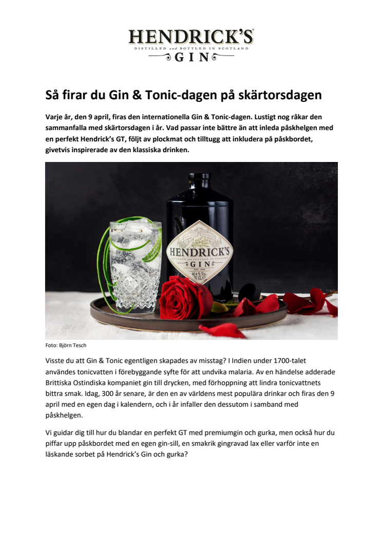 Varje år, den 9 april, firas den internationella Gin & Tonic-dagen. Lustigt nog råkar den sammanfalla med skärtorsdagen i år. Vad passar inte bättre än att inleda påskhelgen med en perfekt Hendrick’s GT, följt av plockmat och tilltugg att inkludera på påskbordet, givetvis inspirerade av den klassiska drinken.