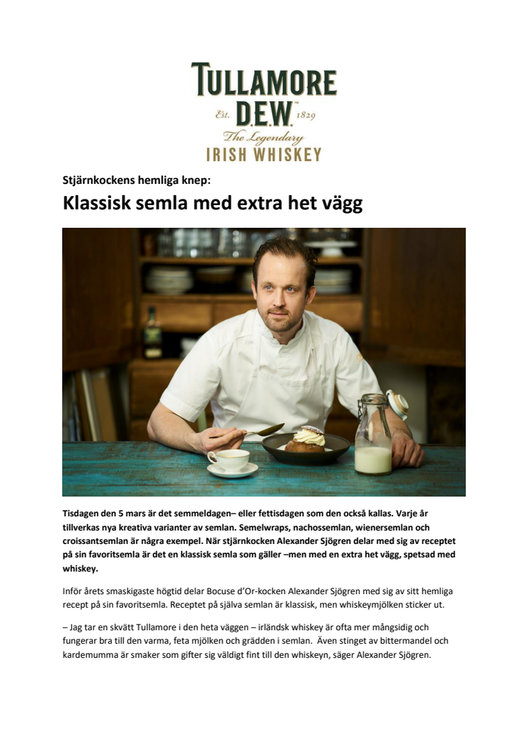 Tisdagen den 5 mars är det semmeldagen– eller fettisdagen som den också kallas. Varje år tillverkas nya kreativa varianter av semlan. Semelwraps, nachossemlan, wienersemlan och croissantsemlan är några exempel. När stjärnkocken Alexander Sjögren delar med sig av receptet på sin favoritsemla är det en klassisk semla som gäller –men med en extra het vägg, spetsad med whiskey.