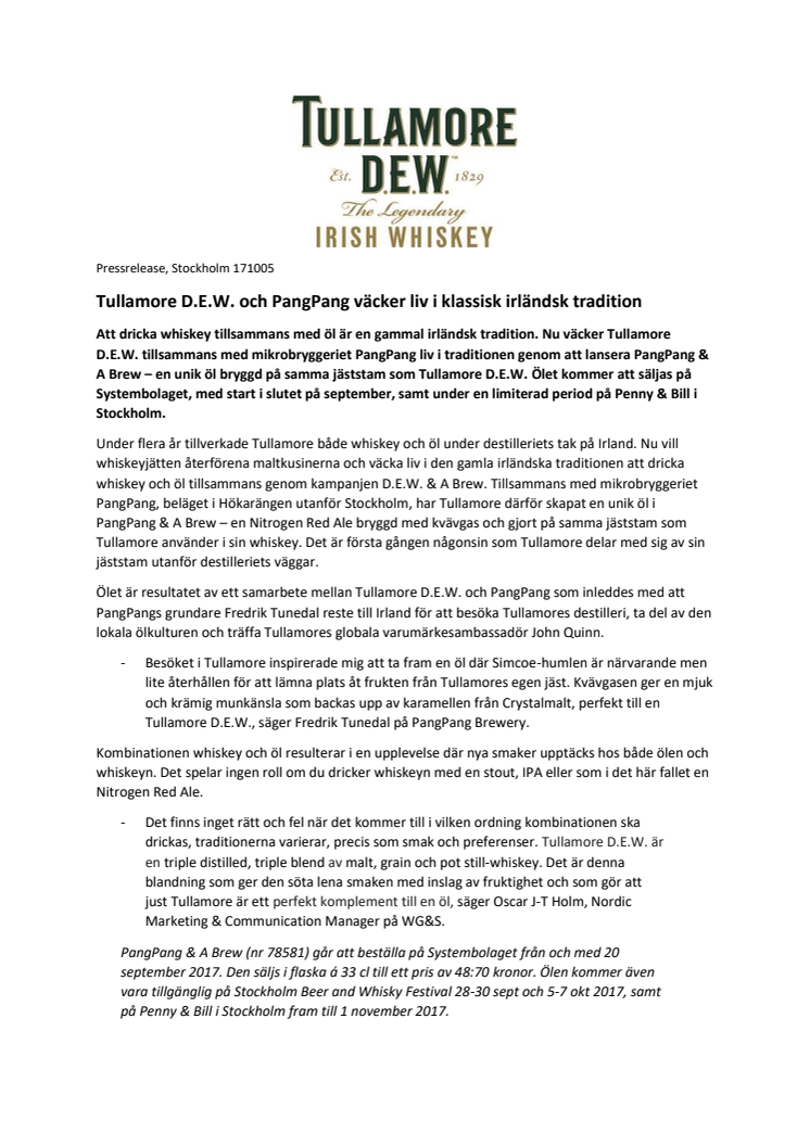 Att dricka whiskey tillsammans med öl är en gammal irländsk tradition. Nu väcker Tullamore D.E.W. tillsammans med mikrobryggeriet PangPang liv i traditionen genom att lansera PangPang & A Brew – en unik öl bryggd på samma jäststam som Tullamore D.E.W. Ölet kommer att säljas på Systembolaget, med start i slutet på september, samt under en limiterad period på Penny & Bill i Stockholm.