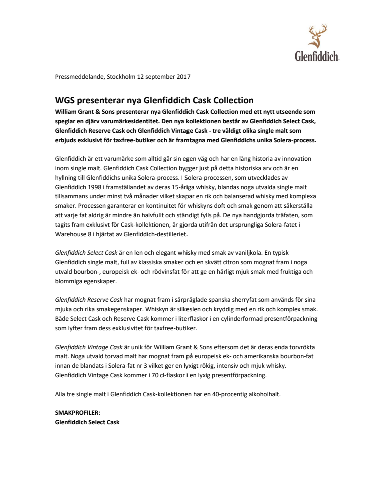 William Grant & Sons presenterar nya Glenfiddich Cask Collection med ett nytt utseende som speglar en djärv varumärkesidentitet. Den nya kollektionen består av Glenfiddich Select Cask, Glenfiddich Reserve Cask och Glenfiddich Vintage Cask - tre väldigt olika single malt som erbjuds exklusivt för taxfree-butiker och är framtagna med Glenfiddichs unika Solera-process.