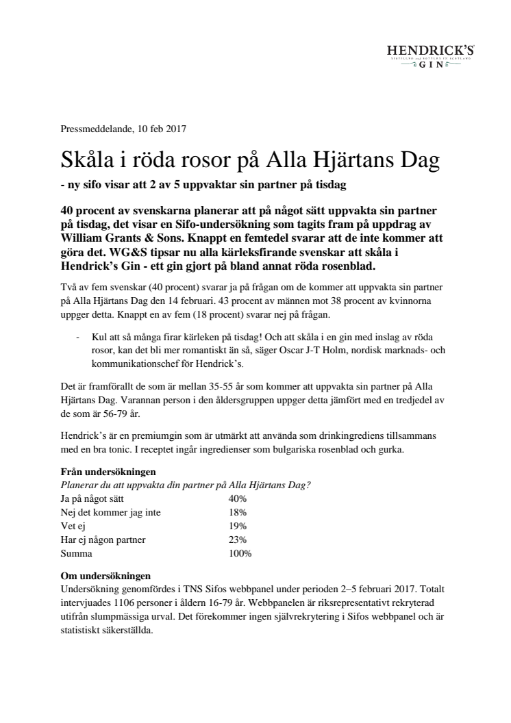40 procent av svenskarna planerar att på något sätt uppvakta sin partner på tisdag, det visar en Sifo-undersökning som tagits fram på uppdrag av William Grants & Sons. Knappt en femtedel svarar att de inte kommer att göra det. WG&S tipsar nu alla kärleksfirande svenskar att skåla i Hendrick’s Gin - ett gin gjort på bland annat röda rosenblad.