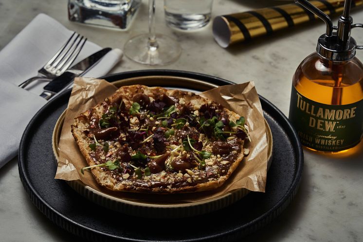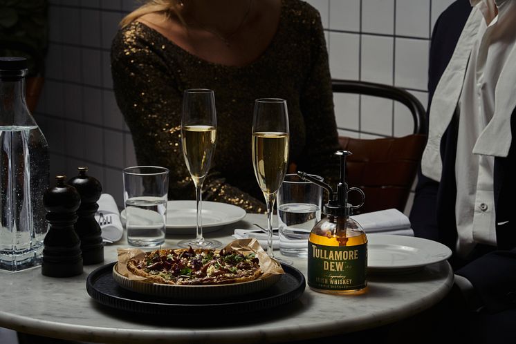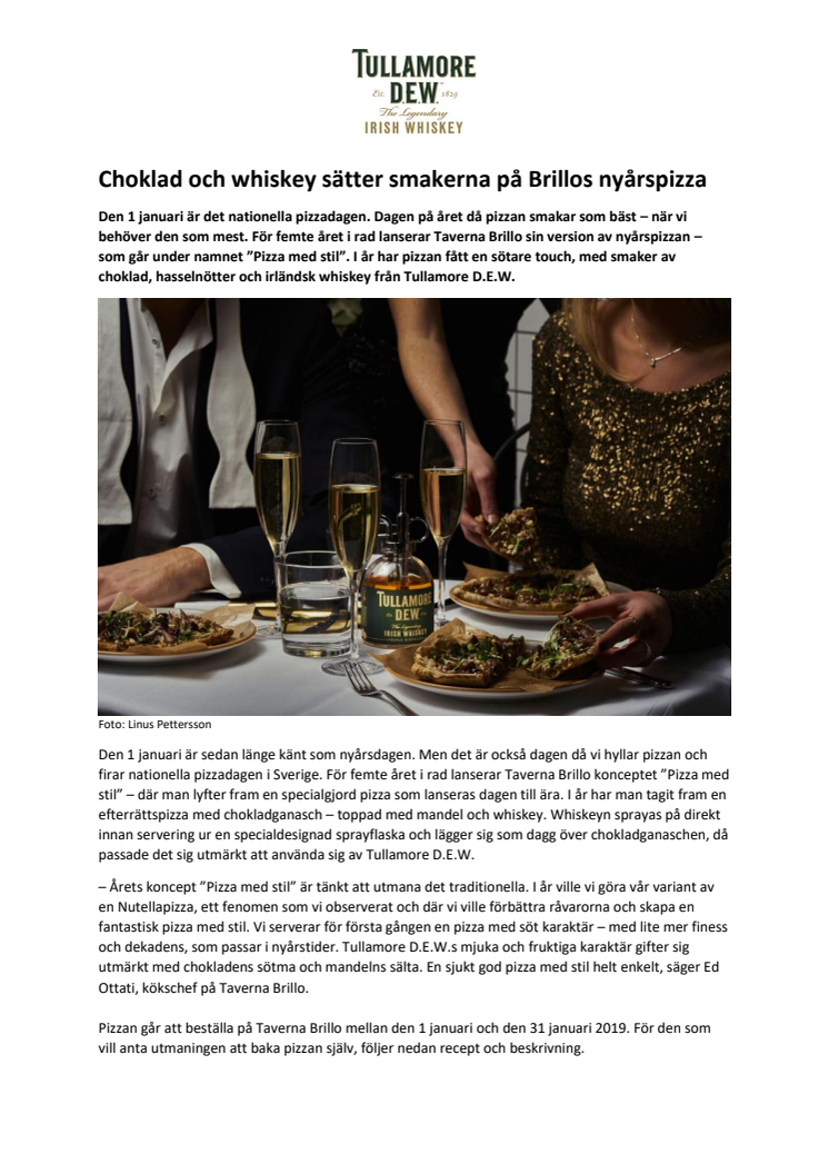Den 1 januari är sedan länge känt som nyårsdagen. Men det är också dagen då vi hyllar pizzan och firar nationella pizzadagen i Sverige. För femte året i rad lanserar Taverna Brillo konceptet ”Pizza med stil” – där man lyfter fram en specialgjord pizza som lanseras dagen till ära. I år har man tagit fram en efterrättspizza med chokladganasch – toppad med mandel och whiskey. Whiskeyn sprayas på direkt innan servering ur en specialdesignad sprayflaska och lägger sig som dagg över chokladganaschen, då passade det sig utmärkt att använda sig av Tullamore D.E.W.