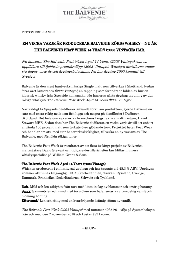 The Balvenie Peat Week (2003 Vintage) med nummer 40351-01 säljs på Systembolaget från och med den 2 november 2018 och kostar 799 kronor.