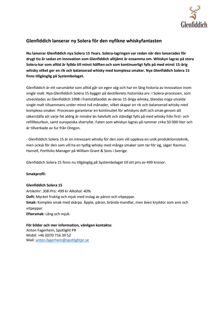 Nu lanserar Glenfiddich nya Solera 15 Years. Solera-lagringen var redan när den lanserades för drygt tio år sedan en innovation som Glenfiddich alltjämt är ensamma om. Whiskyn lagras på stora Solera-kar som alltid är fyllda till minst hälften och som kontinuerligt fylls på med minst 15-årig whisky vilket ger en rik och balanserad whisky med komplexa smaker. Nya Glenfiddich Solera 15 finns tillgänglig på Systembolaget.