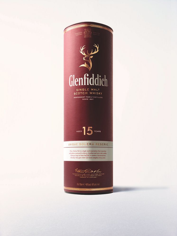 Glenfiddich är ett varumärke som alltid går sin egen väg och har en lång historia av innovation inom single malt. Nya Glenfiddich Solera 15 bygger på destilleriets historiska arv. I Solera-processen, som utvecklades av Glenfiddich 1998 i framställandet av deras 15-åriga whisky, blandas noga utvalda single malt tillsammans under minst två månader, vilket skapar en rik och balanserad whisky med komplexa smaker. Processen garanterar en kontinuitet för whiskyns doft och smak genom att säkerställa att varje fat aldrig är mindre än halvfullt och ständigt fylls på med whisky från first- och refillbourbon, samt europeiska sherryfat. Faten som whiskyn lagras på rymmer cirka 50 000 liter och är tillverkade av fur från Oregon.