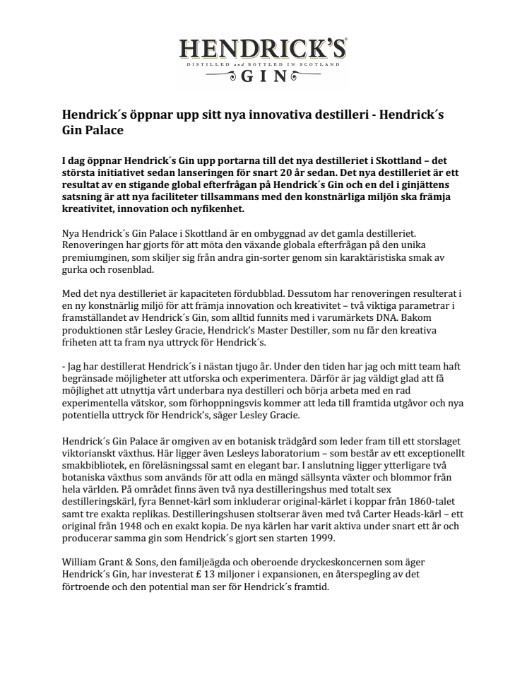 Med det nya destilleriet är kapaciteten fördubblad. Dessutom har renoveringen resulterat i en ny konstnärlig miljö för att främja innovation och kreativitet – två viktiga parametrar i framställandet av Hendrick´s Gin, som alltid funnits med i varumärkets DNA. Bakom produktionen står Lesley Gracie, Hendrick’s Master Destiller, som nu får den kreativa friheten att ta fram nya uttryck för Hendrick´s.