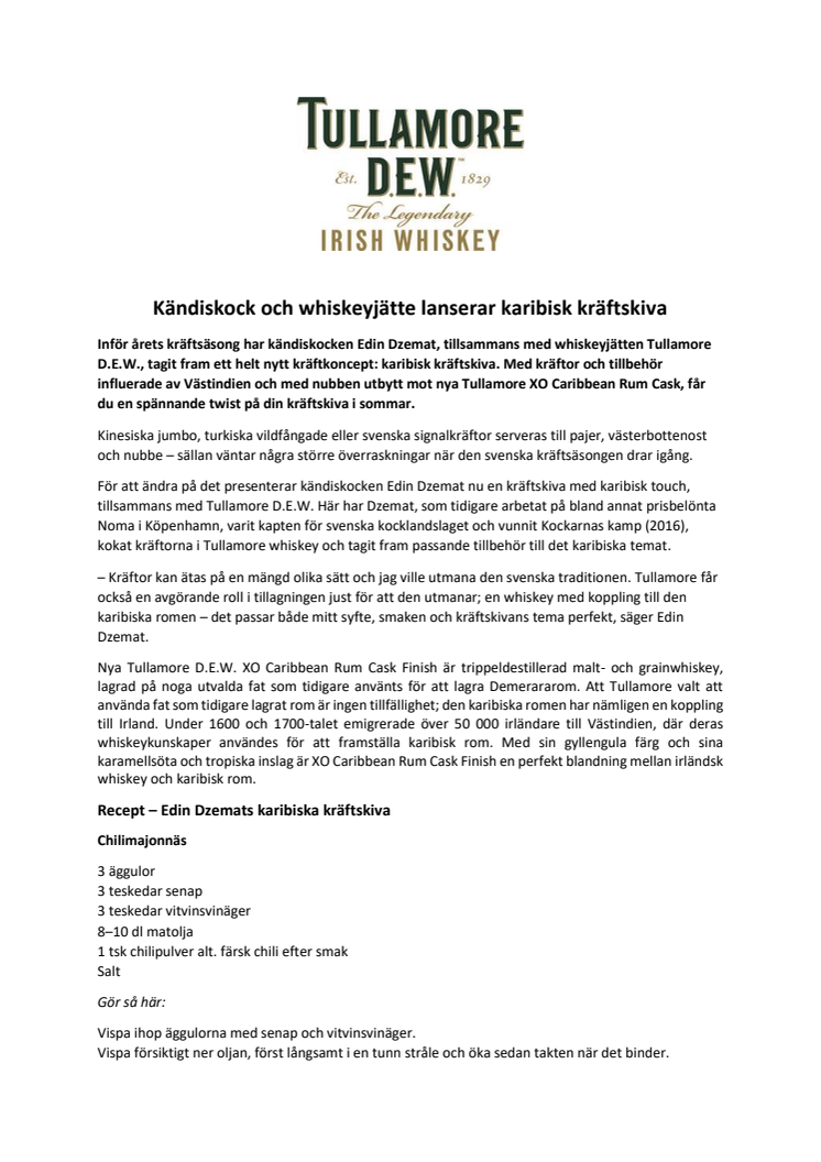 Inför årets kräftsäsong har kändiskocken Edin Dzemat, tillsammans med whiskeyjätten Tullamore D.E.W., tagit fram ett helt nytt kräftkoncept: karibisk kräftskiva. Med kräftor och tillbehör influerade av Västindien och med nubben utbytt mot nya Tullamore XO Caribbean Rum Cask, får du en spännande twist på din kräftskiva i sommar.