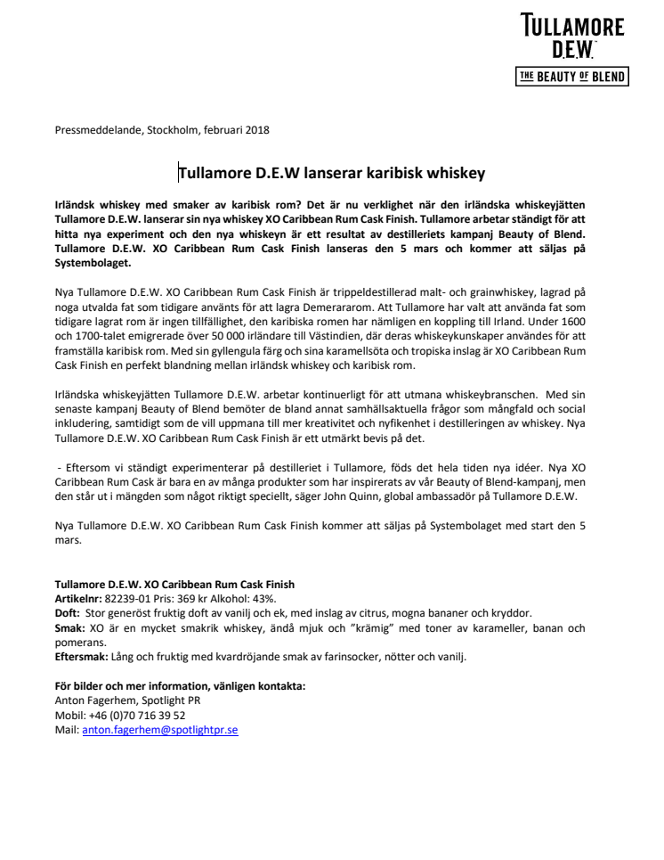 Irländsk whiskey med smaker av karibisk rom? Det är nu verklighet när den irländska whiskeyjätten Tullamore D.E.W. lanserar sin nya whiskey XO Caribbean Rum Cask Finish. Tullamore arbetar ständigt för att hitta nya experiment och den nya whiskeyn är ett resultat av destilleriets kampanj Beauty of Blend. Tullamore D.E.W. XO Caribbean Rum Cask Finish lanseras den 5 mars och kommer att säljas på Systembolaget.