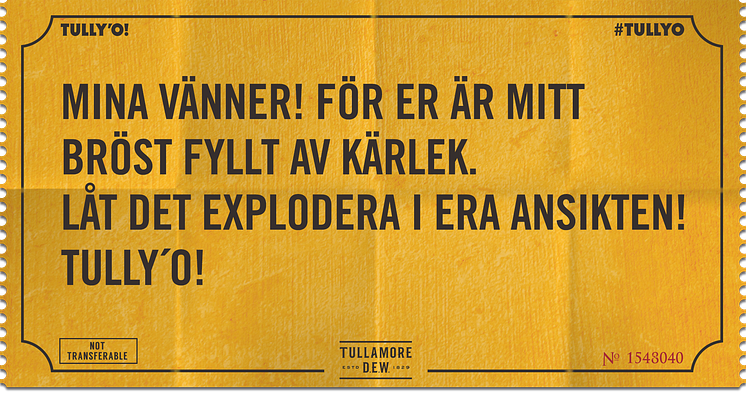 Den irländska whiskeyproducenten Tullamore D.E.W. lanserar nu Tully’O - framtidens skål. En Tully’O är en modern skål där tradition möter artificiell intelligens och förenar irländska och svenska traditioner. Ett möte mellan en irländsk berättartradition och svenska snapsvisor, i en ny modern tappning. Besökare välkomnas till en generator som i sin tur lämnar en skräddarsydd Tully’O att utbringa i syfte att skänka glädje, skratt och gemenskap i fysisk såväl som digital form.