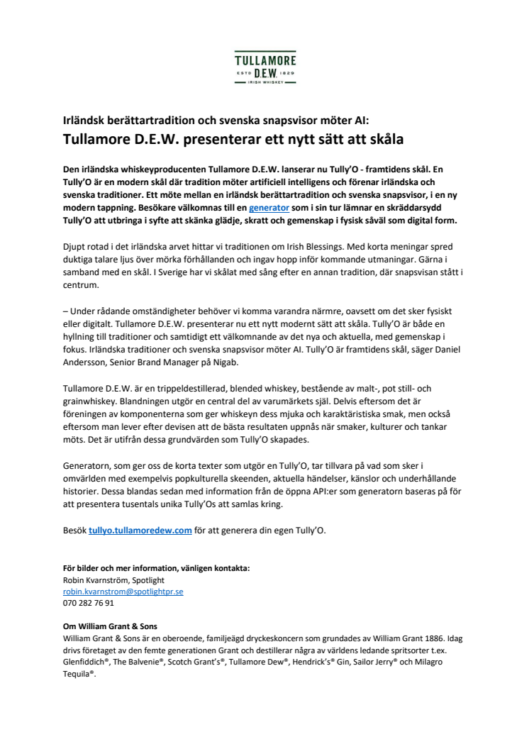 – Under rådande omständigheter behöver vi komma varandra närmre, oavsett om det sker fysiskt eller digitalt. Tullamore D.E.W. presenterar nu ett nytt modernt sätt att skåla. Tully’O är både en hyllning till traditioner och samtidigt ett välkomnande av det nya och aktuella, med gemenskap i fokus. Irländska traditioner och svenska snapsvisor möter AI. Tully’O är framtidens skål, säger Daniel Andersson, Senior Brand Manager på Nigab.