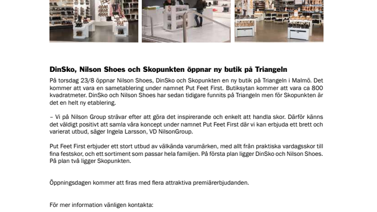 På torsdag 23/8 öppnar Nilson Shoes, DinSko och Skopunkten en ny butik på Triangeln i Malmö. Det kommer att vara en sametablering under namnet Put Feet First. Butiksytan kommer att vara ca 800 kvadratmeter. DinSko och Nilson Shoes har sedan tidigare funnits på Triangeln men för Skopunkten är det en helt ny etablering.