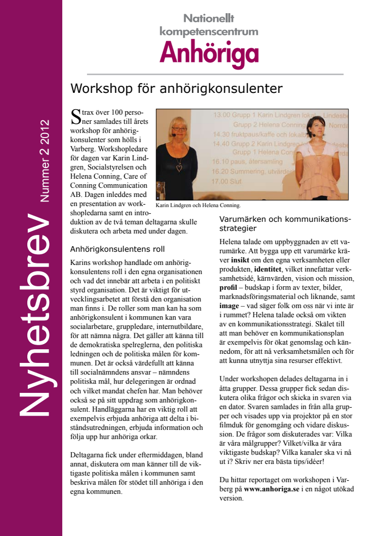 Rubriker i nyhetsbrevet - Workshop för anhörigkonsulenter - Internationell Anhörigriksdag i Varberg - NkA arbetar mot fler anhöriga via nya projekt - NkA:s mötesdagar.