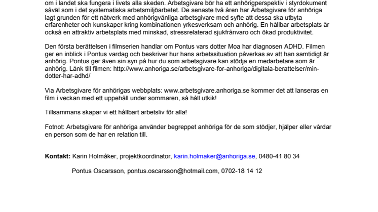 Den första berättelsen i filmserien handlar om Pontus vars dotter Moa har diagnosen ADHD. Filmen ger en inblick i Pontus vardag och beskriver hur hans arbetssituation påverkas av att han samtidigt är anhörig. Pontus ger även sin syn på hur du som arbetsgivare kan stödja en medarbetare som är anhörig. Länk till filmen: http://www.anhoriga.se/arbetsgivare-for-anhoriga/digitala-berattelser/min-dotter-har-adhd/