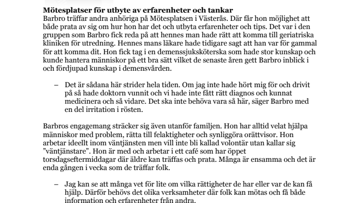 Barbro Rohlin är en engagerad och stark person som hela sitt liv har vågat ifrågasätta och säga vad hon tycker. När hennes man fick diagnosen Vaskulär demens och Alzheimer kom de egenskaperna väl till pass.