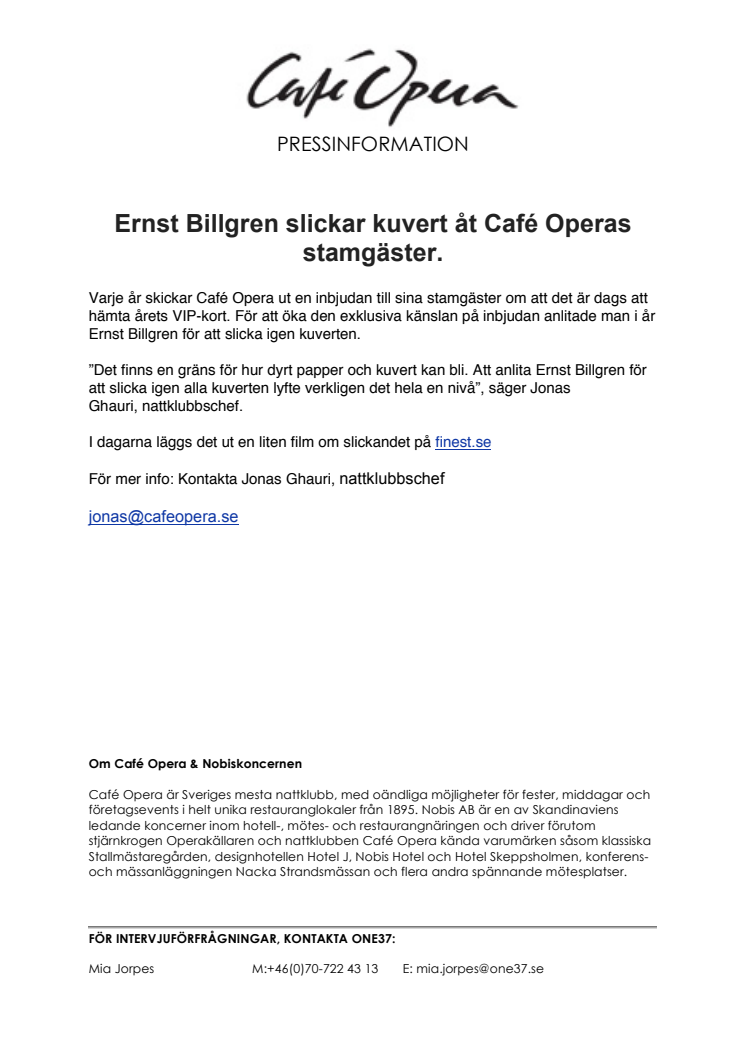 Varje år skickar Café Opera ut en inbjudan till sina stamgäster om att det är dags att hämta årets VIP-kort. För att öka den exklusiva känslan på inbjudan anlitade man i år Ernst Billgren för att slicka igen kuverten.