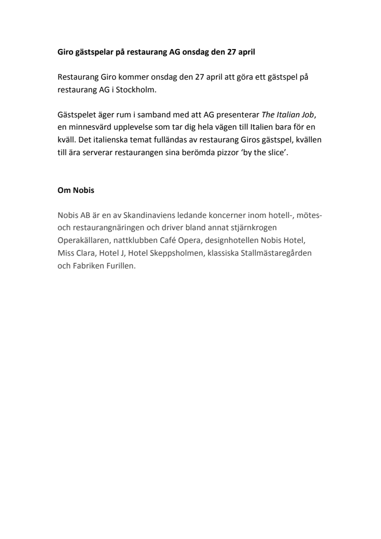 Restaurang Giro kommer onsdag den 27 april att göra ett gästspel på restaurang AG i Stockholm.
