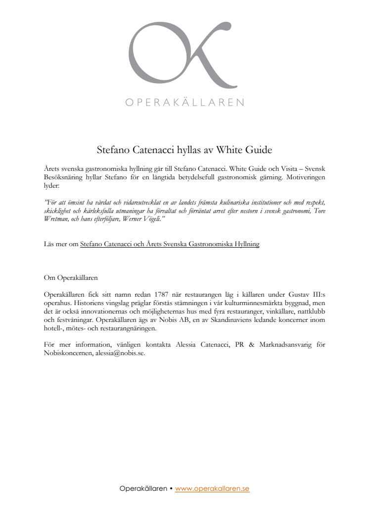 Årets svenska gastronomiska hyllning går till Stefano Catenacci. White Guide och Visita – Svensk Besöksnäring hyllar Stefano för en Långtida Betydelsefull Gastronomisk Gärning.