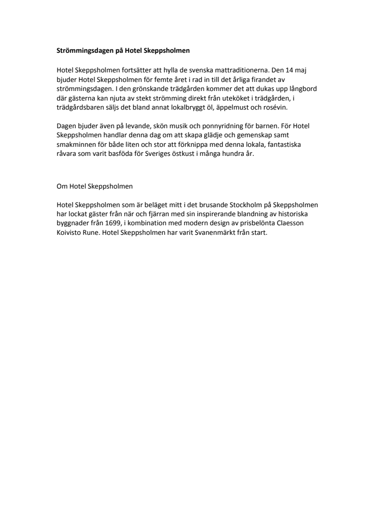Hotel Skeppsholmen fortsätter att hylla de svenska mattraditionerna. Den 14 maj bjuder Hotel Skeppsholmen för femte året i rad in till det årliga firandet av strömmingsdagen. I den grönskande trädgården kommer det att dukas upp långbord där gästerna kan njuta av stekt strömming direkt från uteköket i trädgården, i trädgårdsbaren säljs det bland annat lokalbryggt öl, äppelmust och rosévin.