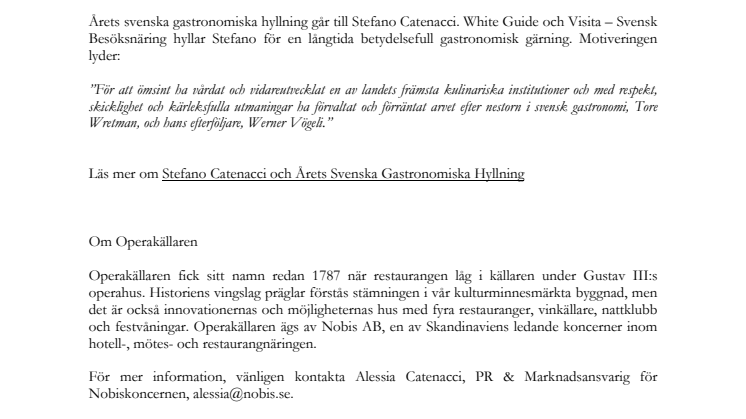 Årets svenska gastronomiska hyllning går till Stefano Catenacci. White Guide och Visita – Svensk Besöksnäring hyllar Stefano för en Långtida Betydelsefull Gastronomisk Gärning. Motiveringen lyder: