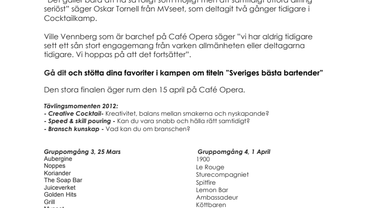 Café Opera och Pernod Ricard välkomnar dig till gruppomgång 3 - Cocktailkamp 2012!