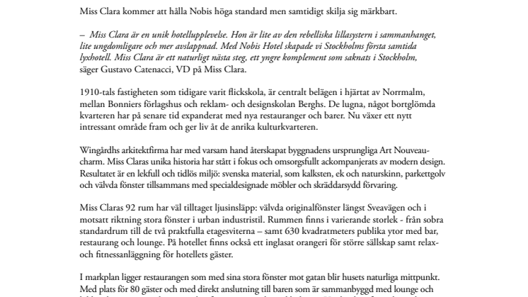 – Miss Clara är en unik hotellupplevelse. Hon är lite av den rebelliska lillasystern i sammanhanget, lite ungdomligare och mer avslappnad. Med Nobis Hotel skapade vi Stockholms första samtida lyxhotell. Miss Clara är ett naturligt nästa steg, ett yngre komplement som saknats i Stockholm, säger Gustavo Catenacci, VD på Miss Clara.