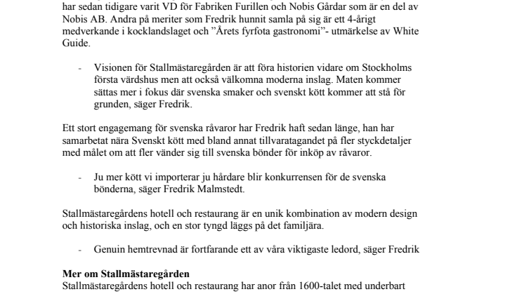 Nobis välkomnar Fredrik Malmstedt som ny VD för Stallmästaregården.