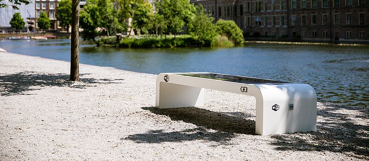 Smart Solar Bench med LED belyst sits av solpanel, WIFI och trådlösa laddningspots samt USB-uttag.
